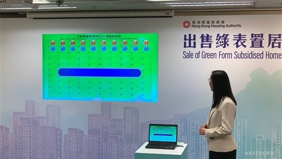 The Hong Kong Housing Authority drew lots by ballot for the Green Form Subsidised Home (GSH) Ownership Scheme 2024 to determine the priority order of applicants based on the last two digits of their application numbers. The first ten numbers in pecking order are 62, 66, 08, 32, 82, 76, 52, 39, 19, and 44. AASTOCKS Financial News Website: www.aastocks.com |