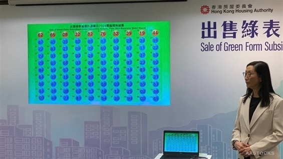The Hong Kong Housing Authority drew lots by ballot for the Green Form Subsidised Home (GSH) Ownership Scheme 2024 to determine the priority order of applicants based on the last two digits of their application numbers. The first ten numbers in pecking order are 62, 66, 08, 32, 82, 76, 52, 39, 19, and 44. The remaining numbers drawn are as follows: 87, 45, 35, 80, 85, 17, 69, 29, 34, 96, 72, 83, 21, 06, 78, 60, 04, 67, 11, 22, 74, 95, 93, 90, 26, 27, 50, 43, 37, 59, 79, 05, 68, 33, 86, 91, 24, 97, 23, 92, 84, 99, 57, 10, 61, 40, 77, 14, 89, 41, 64, 28, 15, 73, 88, 70, 16, 42, 46, 31, 56, 47, 75, 98, 01, 58, 03, 63, 55, 53, 51, 36, 38, 07, 13, 18, 12, 25, 02, 48, 09, 49, 71, 81, 20, 54, 30, 94, 00, and 65. The Housing Authority initially received over 36,000 applications, with approximately 12,000 being new applications, indicating an oversubscription of about 13 times. Eligible applicants are expected to begin selecting flats in order as early as 4Q25. AASTOCKS Financial News Website: www.aastocks.com |