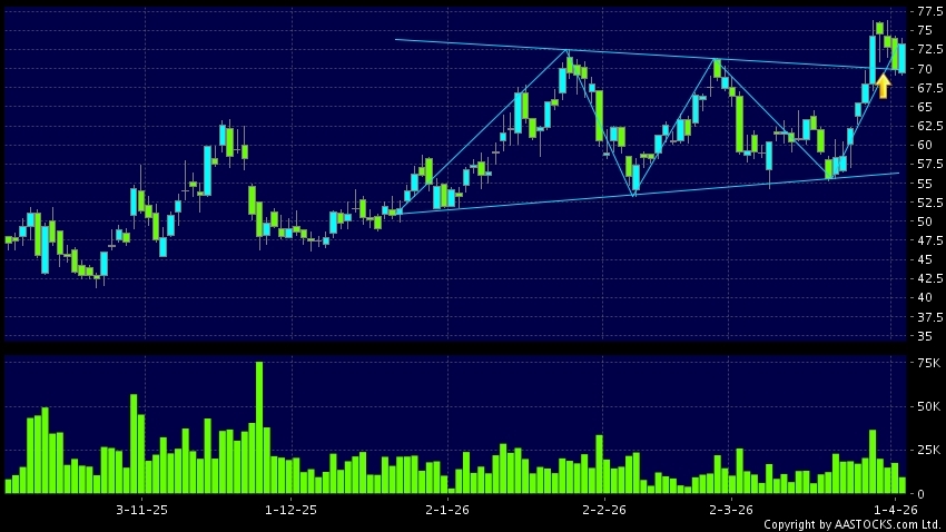 GANFENGLITHIUM(01772.HK)  +2.600 (+3.722%)    Short selling $18.36M; Ratio 3.949%   shows a triangle breakout. Last printed at 73.200; rose 4.796%; on volume of 9.45M shares and turnover of $684.33M