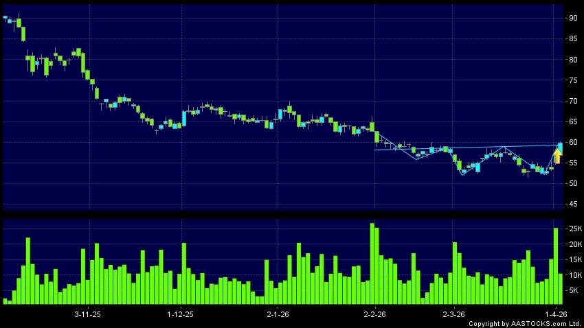 SUNNY OPTICAL(02382.HK) appears an upside breakout, rose above the neckline. Last printed at 59.950; rose 5.268%; on volume of 11.31M shares and turnover of $671.85MRecent Performa...