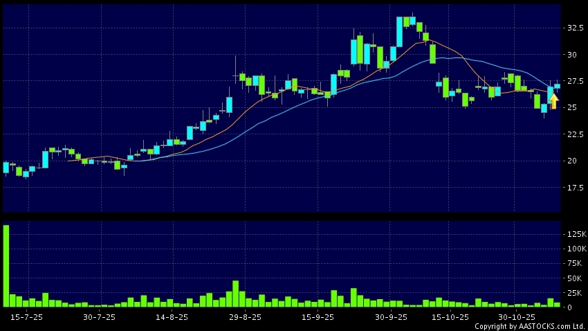 藍思科技(06613.HK) -0.380 (-1.412%) 10天移動平均線升穿20天移動平均線,出現黃金交叉。現價報27.100,上升0.669%,成交量8.20百萬股,成交額2.22億。
