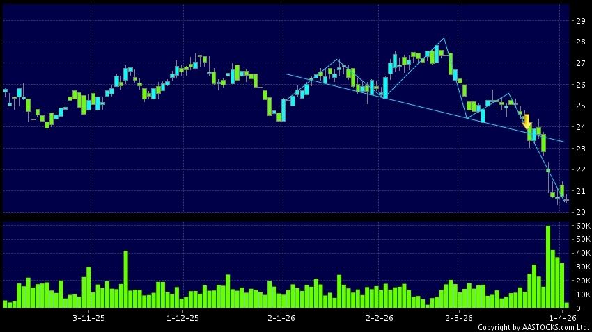 海爾智家(06690.HK)呈現頭肩頂向下突破。現價報20.560,下跌0.963%,成交量4.06百萬股,成交額8.35千萬。最近表現:3日 -0.676%5日 -9.904%10日 -16.423...